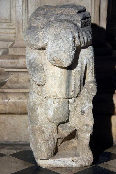 - NOTIZIE STORICO CRITICHE La statua proviene dal protiro dei Leoni Bianchi, dove è stata sostuita da una copia ottocentesca. I documenti contabili della Misericordia Maggore ricordano infatti che, tra il 1867 e il 1868, sotto la direzione di Angelo Cattò, il marmorino Giuseppe Fossati eseguì una replica della scultura, corredata da una nuova colonna in marmo bianco di Candoglia; il telamone trecentesco fu depositato nel cortile dell'Istituto Musicale Donizetti, e spostato in seguito all'interno della basilica (Buonincontri, 2005, p. 248).