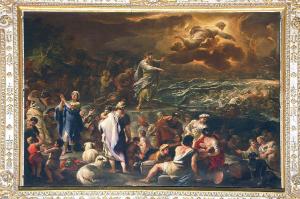 - NOTIZIE STORICO CRITICHE Il grande telero, che raffigura l'episodio del passaggio del MarRosso, avvenuto durante la fuga del popolo ebraico dall'Egitto, sotto la guida di Mosè (Esodo, 14,15-15,1), reca in basso al centro la data 1681 e la firma di Luca Giordano. Il celere artista eseguì il dipinto a Napoli: da qui, nell'aprile del 1682, l'opera fu inviata a Venezia, presso il mercante Simone Giogalli, che faceva da intermediario tra Luca Giordano e il Consiglio della Misericordia, e infine a Bergamo. Quando il "Passaggio del Mar Rosso" giunse a destinazione, i membri del Consiglio ne furono entusiasti, al punto che decisero di aggiungere un premio di 100 scudi al compenso di 700 pattuito nel contratto, e tentarono inutilmente di convincere il pittore napoletano a proseguire la sua collaborazione con la Basilica di Santa Maria Maggiore. L'incarico per gli affreschi della navata e per i quattro dipinti ad olio che erano previsti per completare la decorazione della chiesa fu poi affidato, qualche anno dopo, a Nicolò Malinconico (Noris, in "I pittori bergamaschi...Il Seicento", vol. IV, p. 167, scheda 11)..\nLa tela, che affascinò i membri del Consiglio per "finezza di pittura e per bellissima invenzione del dissegno", è inserita in ina ricca cornice modellata in stucco: ai lati, dua figure di profeti, pure in stucco, presentano l'opera al pubblico: Isaia, sulla destra, regge una tavola che reca inciso, ben visibile, un passo del suo libro dedicato all'episodio del passaggio del Mar Rosso. \nL'opera è stata restaurata nel 1959 da Franco Steffanoni che, nella sua relazione conclusiva, scrive che il dipinto aveva già subito altri interventi, in date imprecisate (cfr. relazione in data 9 settembre 1959, protoc. 1735, cat. MM, clas. IV, fasc. 5/c, Archivio Congregazione Misericordia Maggiore, Bergamo).