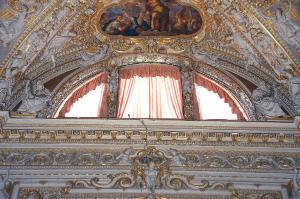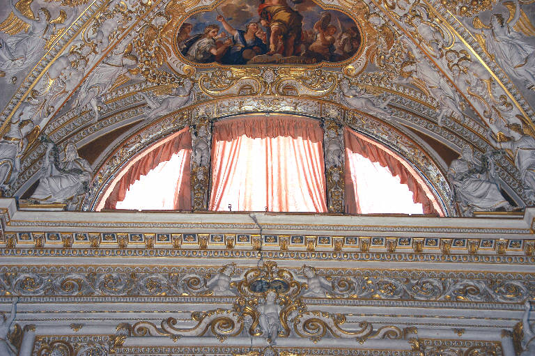 Decorazione della lunetta posta attorno alla finestra della navata centrale: agli angoli, figure di profeti reggono cartigli con iscrizioni dipinte; sopra la cornice che delimita la finestra, motivi decorativi a volute con al centro una testina d'angelo e due figure di angioletti; i due pilastrini che dividono lo spazio della finestra sono ornati da testine d'angelo, motivi di fiori e frutti e figure d'angioletti in forma di cariatide, disposti a candelabra.