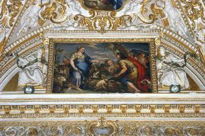 Decorazione della lunetta che racchiude la cornice con "Rebecca al pozzo" di Nicolò Malinconico : agli angoli, figure di profeti reggono cartigli con iscrizioni dipinte; al centro, cornice architravata ornata da motivi decorativi dorati; sopra l'architrave, due figure di angioletti distesi e, al centro, motivo a volute.