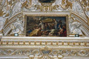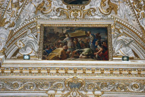 Decorazione della lunetta che racchiude la cornice con il "Trasporto dell'arca dell'Alleanza" di Nicolò Malinconico : agli angoli, figure di profeti reggono libri; al centro, cornice architravata ornata da motivi decorativi dorati; sopra l'architrave, due figure di angioletti distesi e, al centro, motivo a volute.