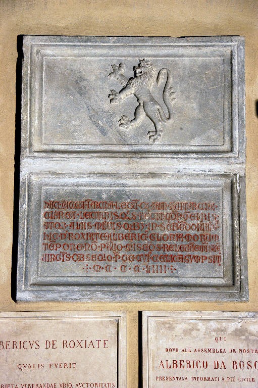 - NOTIZIE STORICO CRITICHE La lapide, che reca lo stemma di Alberico da Roxiate , era posta un tempo nel Monastero dei Celestini: come ricorda l'altra lapide posta sotto questa, sulla destra; nel 1868 il Consiglio cittadino di Bergamo decise di trasferire l'opera nella Basilica di Santa Maria Maggiore, per celebrare degnamente la memoria del nobile giureconsulto.