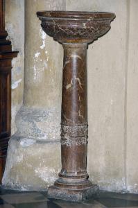 Acquasantiera ad alto fusto decorato, nella parte finferiore, da un festone di fiori, sormontato da una fascia delimitata da due elementi modanati che racchiude tralci di fiori e foglie; vasca ad alto bordo, decorata esternamente da un motivo a scaglie, eseguito ad incisione.