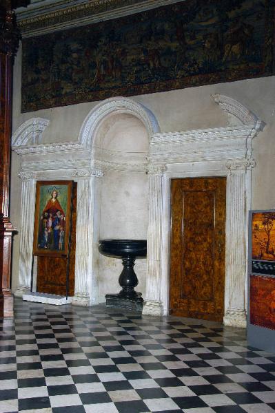 Mostra di nicchia in marmo bianco scolpito a tre aperture: la struttura è sorretta da due pilastri e da due semipilastri scanalati con capitelli d'ordine ionico; la profonda nicchia centrale, con arco a tutto centro, ospita un acquasantiera in marmo nero; le aperture laterali, architravate, incorniciano portine in radica di noce; alle due estremità, sopra l'architrave, elementi ricurvi di timpano spezzato.