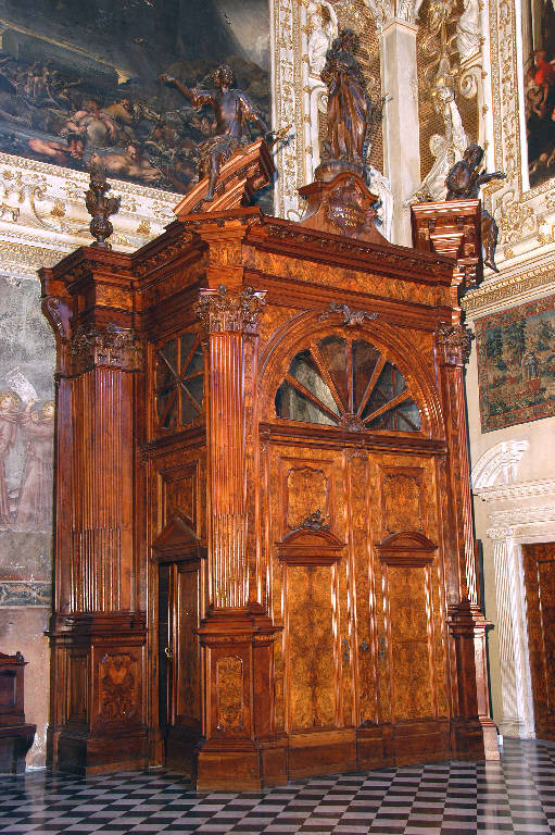 - NOTIZIE STORICO CRITICHE La bussola d'ingresso al transetto destro fu realizzata, come documenta l'iscrizione posta sul pilastro angolare a sinistra, dall'intagliatore bergamasco Giuseppe Alari probabilmente attorno al 1770, che è la data segnata sull'identica bussola del braccio sinistro del transetto; le statue del coronamento sono tradizionalmente attribuite allo scultore d'origine austriaca Giovanni Antonio Sanz (Pinetti, 1931, p. 87; Zanchi, 2003, 387).\nL'opera è stata sottoposta nel 1998 ad un complesso intervento di restauro (cfr. relazione tecnica in data 13 maggio 1998, prot. 1821, cat. 5, clas. 6, fasc. 17, Archivio Congregazione Misericordia Maggiore, Bergamo).