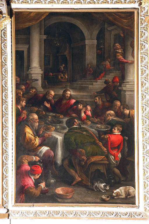 - NOTIZIE STORICO CRITICHE Non sappiamo molto di questa "Ultima cena" di Francesco Bassano, abilmente costruita e ricca di riferimenti alla grande pittura di Tintoretto: il solo documento che ne parla è, infatti, un sollecito inviato al pittore dai deputati della Misericordia Maggiore il 9 novembre 1586, perché consegnasse, infine, l'ancona da porre all'altare del SS. Sacramento (Olivari, in "I pittori bergamaschi...Il Seicento", vol. II, p. 180, scheda 8). Con ogni probabilità, la commisssione gli era stata affidata attorno al 1584: in quell'anno, infatti, Francesco e Lorenzo Porta eseguirono gli stucchi della cappella; e in quell'anno Giovan Paolo Lolmo firmò il contratto per la "Raccolta della manna", collocata nel registo superiore della parete di fondo della stessa cappella. \n L'opera è stata sottoposta ad una leggera pulitura nel 1986 (cfr. documento in data 25/ 9/ 1986, protoc. 1497, pratica 4651, cartt. 90, Archivio Congregazione Misericordia Maggiore, Bergamo).