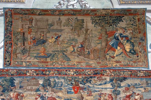 - NOTIZIE STORICO CRITICHE L'arazzo appartiene ad una serie di tre, tutti caratterizzati dalla presenza di uno stemma a bande bianche e azzurre e tutti dedicati al racconto, per riquadri successivi, di un dramma d'amore d'intonazione cavalleresca, ancora non identificato; la serie è convenzionalmente detta "di Daneo", per via della scritta che compare, ben visibile e ripetuta due volte, in questo arazzo; secondo Meli la storia allude forse al mito di Perseo, figlio di Danae, e talvolta chiamato, appunto, Daneo (Meli, 1962, p. 20). \nL'opera, che proviene probabilmente da una manifattura fiamminga attiva nella prima metà del XVI secolo, fu acquistata dai deputati della Misericordia Maggiore tra il 1627 e il 1672: in questi anni, infatti, i libri contabili della MIA registrano diverse annotazioni che riguardano spese per arazzi destinati ad adornare la Basilica di Santa Maria Maggiore; non è facile, però, individuare con precisone i singoli pezzi, per mancanza di elementi (Meli, 1962, pp. 9- 16 e 20-22; Zanchi, 2003, pp. 349-350).\nL'arazzo è stato sottoposto ad un complesso intervento di restauro nel 2002 (cfr. doc. in data 8 ottobre 2002, protoc. 3307, cat. 5, clas. 7, fasc. 4,, Archivio Congregazione della Misericordia Maggiore, Bergamo).