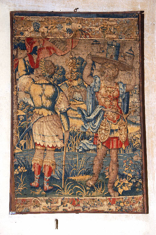 - NOTIZIE STORICO CRITICHE L'arazzo appartiene ad una serie di cinque, tutti dedicati al racconto, per episodi, di un lungo corteo trionfale di soldati romani e chiamati convenzionalmente, per questo, "arazzi del Trionfo di Vespasiano". \nL'opera, che proviene probabilmente da una manifattura di Bruxelles attiva sulla metà del XVI secolo, fu acquistata dai deputati della Misericordia Maggiore forse nel 1627: i libri contabili della MIA registrano infatti, alla data del 23 agosto di quell'anno, una nota che concede ai deputati "libertà ...di comperar quattro pezzi di Razzi historiati con figure grandi...per guarnir le cantorie della chiesa di Santa Maria", che la letteratura critica identifica, solitamente, con gli arazzi del "Trionfo"; anche il frammento con i due soldati, quinto della serie e non menzionato nel documento, potrebbe essere stato acquistato nella stessa occasione (Meli, 1962, p. 14 e pp. 16-18; Zanchi, 2003, pp. 349-350).