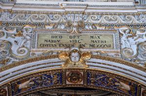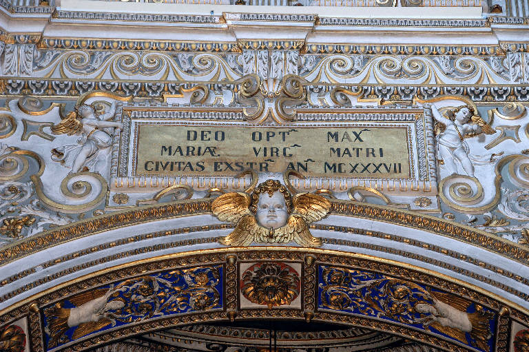 - NOTIZIE STORICO CRITICHE La coppia di angioletti posta a reggere la targa che ricorda l'anno di fondazione della chiesa è stata realizzata da Lorenzo Porta, stuccatore originario di Osteno, sul lago di Lugano, tra il 1615 e il 1616: in quegli anni, infatti, i libri contabili della Basilica registrano pagamenti per i lavori di decorazione che interessarono l'intera area della cupola a Lorenzo, appunto, e ai figli Girolamo e Giovanni Battista (Cortesi Bosco, in "I pittori bergamaschi...Il Seicento", vol. II, pp. 92-94, nota 5)