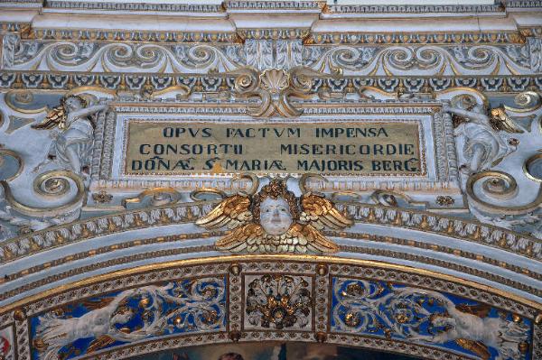 - NOTIZIE STORICO CRITICHE La coppia di angioletti posta a reggere la targa che ricorda con orgoglio il ruolo del Consorzio della Misericordia Maggiore nella fondazione della chiesa è stata realizzata da Lorenzo Porta, stuccatore originario di Osteno, sul lago di Lugano, tra il 1615 e il 1616: in quegli anni, infatti, i libri contabili della Basilica registrano pagamenti per i lavori di decorazione che interessarono l'intera area della cupola a Lorenzo, appunto, e ai figli Girolamo e Giovanni Battista (Cortesi Bosco, in "I pittori bergamaschi...Il Seicento", vol. II, pp. 92-94, nota 5)