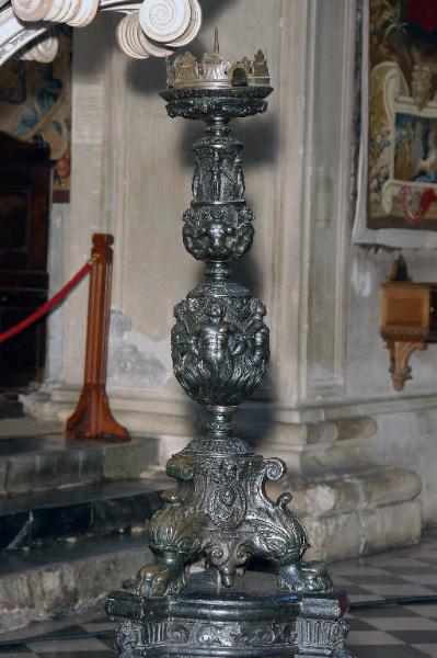 - NOTIZIE STORICO CRITICHE Il Pinetti, nel 1931, scrive che questo candeliere in bronzo, con gli altri cinque che compongono la serie, è stato realizzato nel 1597 dal maestro bresciano Camillo Rizzetti, senza citare però la fonte da cui traeva l'informazione (Pinetti, 1931, p. 87).\nL'opera è stata restaurata nel 2000 (cfr. relazione tecnica in data 10 aprile 2000, protoc. 919, cat. 5, clas. 6, fasc. 20, Archivio Congregazione Misericordia Maggiore, Bergamo).