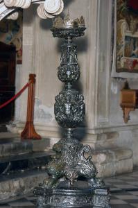 Candeliere in bronzo poggiante su base in legno scolpito: base triangolare con piedi a zampe di leone e facce ad ornati di fogliami che circondano tre medaglioni con busti di santi a rilievo, coronati da testine d'angelo; fusto a due nodi: il primo reca quattro busti di anime purganti tra le fiamme; il secondo è ornato, in basso, da altre quattro figure virili nude e, in alto, da quattro putti che si tengono per mano; piattello con testine d'angelo e festoni.