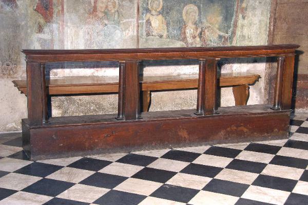Coppia di inginocchiatoi in legno di noce: su alto basamento, parapetto a tre aperture divise da pilastrini affiancati da colonnine a fusto liscio d'ordine dorico; piano superiore d'appoggio liscio, appena sporgente.