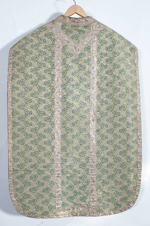 Paramento liturgico in seta cannetillé color verde chiaro ricoperta da una laminatura argento. Il motivo decorativo, di ridotte dimensioni modulari, è articolato in piccole partiture romboidali schiacciate. All'interno di questo elegante traillage, su di un fondo trattato a spina di pesce dalle diagonali argento, sono disposti mazzi di fiori alternativamente rivolti verso destra e sinistra. Ornano il parato galloni eseguiti a telaio in argento filato e argento laminato.