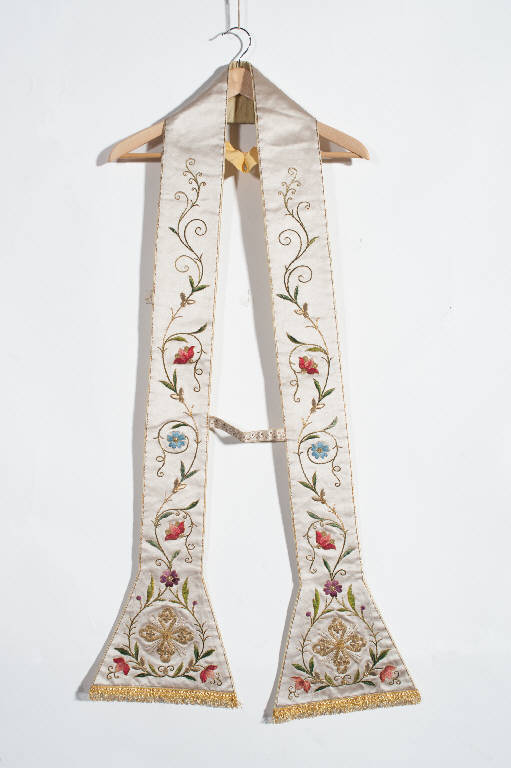 Stola in raso bianco. I motivi a riporto, eseguiti in seta policroma, oro filato, oro laminato e canutiglia oro, presentano tralci d'acanto che si snodano dal basso verso l'alto disegnando eleganti girali con fiori al centro (viole, margherite e peonie). Il disegno si struttura in maniera speculare rispetto all'asse mediano. Le terminazioni trapezoidali sono dotate di croci ricamate in oro filato e oro laminato. Fodera in Gros de Tours di seta giallo.
