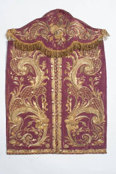 Conopeo di tabernacolo in seta viola. Il motivo decorativo, eseguito a ricamo in oro filato e oro laminato con applicazione di paillettes dorate, occupa tutta la superficie. Nelle due tendine il disegno si sviluppa dal basso verso l'alto ed è costituito da una complessa ed elaborata struttura speculare di fogliame, ampi girali, volute, peonie e boccioli. La stessa tipologia, speculare rispetto ad un asse centrale, si ritrova nella balza. I bordi interni sono rifiniti con galloni in oro filato e oro laminato eseguiti a fuselli. Fodera in tessuto rosso