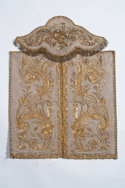- NOTIZIE STORICO CRITICHE Il conopeo di tabernacolo è una copertura in stoffa che serve a segnalare la presenza del Sacramento. La forma può essere a padiglione, tutto intorno al tabernacolo, o più semplicemente a tendina che ricade davanti allo sportello, raddoppiata talora in alto da una balza. Non esistono prescrizioni liturgiche circa la materia e la tipologia del decoro, solitamente raffigurante soggetti simbolici di tema eucaristico, che può essere ricamato o dipinto. Il disegno del conopeo in esame, che richiama ancora modelli settecenteschi, è eseguito a ricamo in oro filato e oro laminato con applicazione di paillettes dorate e occupa tutta la superficie. Benché la scelta dei motivi decorativi (fogliame, ampi girali, volute, peonie e boccioli) sia quella caratteristica dello stile rococò, la struttura rigida dei decori e dell'impaginato indica una rielaborazione in chiave ottocentesca. L'eleganza e la varietà del disegno suggeriscono la realizzazione da parte di una manifattura di pregio di ambito lombardo-veneto. Nella basilica di Santa Maria Maggiore è conservato un conopeo viola che presenta il medesimo ricamo (num. foto 1171).