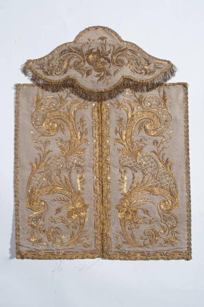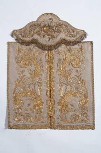 Conopeo di tabernacolo in seta avorio. Il motivo decorativo, eseguito a ricamo in oro filato e oro laminato con applicazione di paillettes dorate, occupa tutta la superficie. Nelle due tendine il disegno si sviluppa dal basso verso l'alto ed è costituito da una complessa ed elaborata struttura speculare di fogliame, ampi girali, volute, peonie e boccioli. La stessa tipologia, speculare rispetto ad un asse centrale, si ritrova nella balza. I bordi sono rifiniti con galloni in oro filato e oro laminato eseguiti a fuselli.