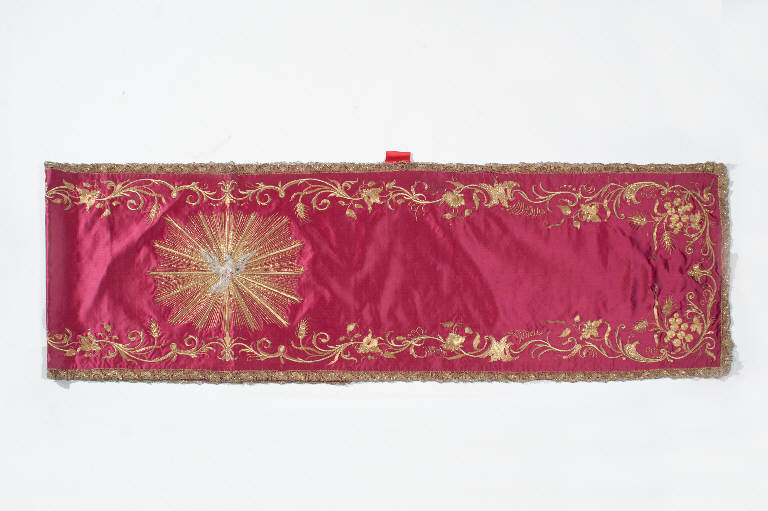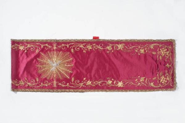 Velo omerale in raso rosso. I motivi decorativi, eseguiti a ricamo in seta, oro filato e oro laminato, sono posizionati lungo il perimetro. Il disegno presenta lo svolgersi sinuoso di racemi vegetali con rose, campanule, volute, foglie d'canto, tralci vitinei e spighe. Al centro la colomba dello Spirito Santo raggiata d'oro. Il velo è rifinito da galloni in oro filato e oro laminato eseguiti a fuselli.
