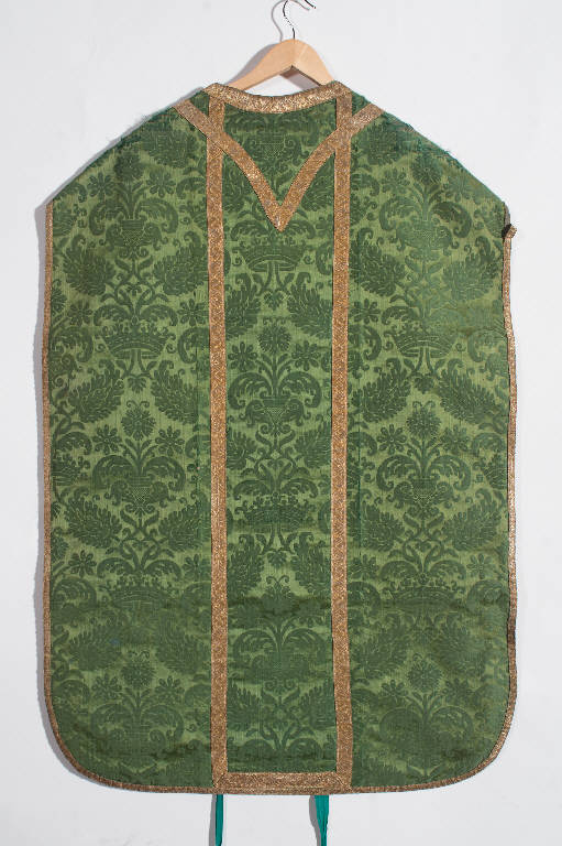 Pianeta in damasco verde. Disegno a maglie romboidali definite da coppie affrontate di foglie dentate entro le quali si dispongono, in teorie alterne, mazzi di tre fiori stilizzati e corone. I bordi sono rifiniti da galloni in oro filato e oro laminato eseguiti a telaio. Fodera in tessuto di lino verde.