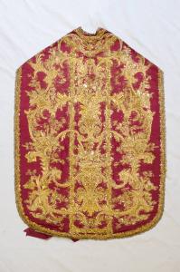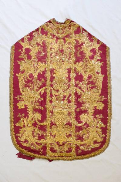 Paramento liturgico in raso rosso. Il ricchissimo ricamo, eseguito in oro filato e oro laminato con applicazione di paillettes, si sviluppa in tralci d'acanto che si allargano in ampi girali, fiori, canestri e foglie.