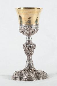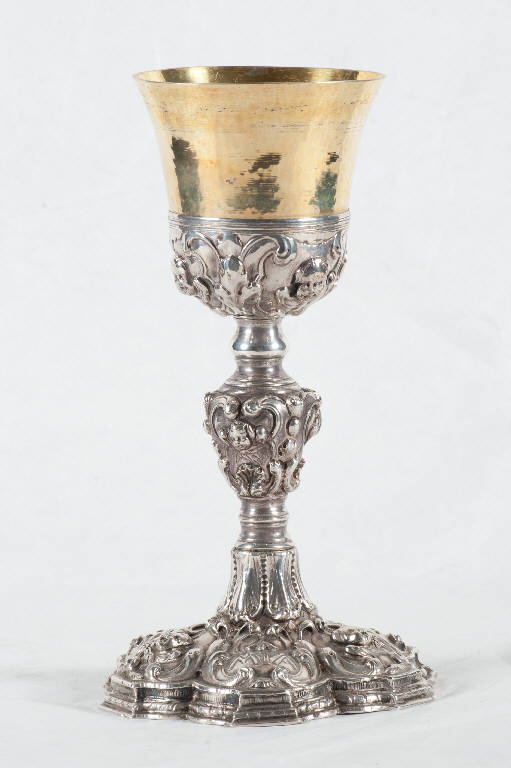 - NOTIZIE STORICO CRITICHE Il calice in esame propone soluzioni stilistiche tipiche del primo Settecento. Il ricco e serrato gioco decorativo, dominato da racemi vegetali, volute e teste di cherubino, riveste una struttura ancora piuttosto massiccia tanto nella base mistilinea esalobata a più gradini quanto nel fusto; questo è risolto nel caratteristico nodo troncopiramidale. Gli ornati sono resi con una tecnica che impiega uno sbalzo tipicamente settecentesco.L'iscrizione "MIA" presente sul piede è ripetuta tre volte.