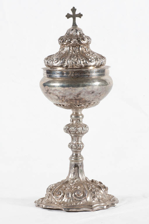 Pisside in argento con base mistilinea a più gradini fortemente bombata percorsa da un gioco di racemi vegetali, volute e fiori. Fusto con nodo piriforme ornato da racemi vegetali; collarino e nodo di raccordo lisci. Coperchio, eseguito a sbalzo, decorato con racemi vegetali, volute e fiori. Croce apicale liscia.