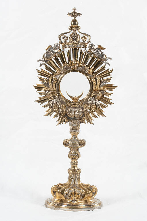 - NOTIZIE STORICO CRITICHE Si tratta del contenitore per l'esposizione dell'ostia consacrata. Il repertorio decorativo dell'ostensorio raggiato in esame indugia su motivi di gusto pienamente settecentesco riproposti con un formulario ripetitivo. Sia nella base allungata, con corpo interno accentuatamente bombato ornato da un gioco di racemi vegetali, volute e valve di conchiglia, che nella raggiera decorata con racemi vegetali, volute, valva di conchiglia, teste di cherubino, serti di spighe e di vite e conclusa da una corona sorretta da due angeli alati sono evidenti i rimandi a soluzioni formali e decorative ricorrenti nelle suppellettili di produzione lombarda della seconda metà del Settecento. Le volute aggettanti che spartiscono verticalmente il piede terminando in un avvitamento suggerirebbero un'appartenenza a tale produzione.
