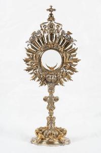 Ostensorio raggiato in ottone argentato e dorato con base mistilinea a più gradini fortemente bombata percorsa da un gioco di racemi vegetali, volute e valve di conchiglia. Fusto con nodo piriforme schiacciato ornato da volute arricciate; collarino e nodo di raccordo lisci argentati e dorati. Raggiera, eseguita a stampo e a sbalzo, decorata con racemi vegetali, volute, valva di conchiglia, teste di cherubino, serti di spighe e di vite conclusa da una corona sorretta da dua angeli.