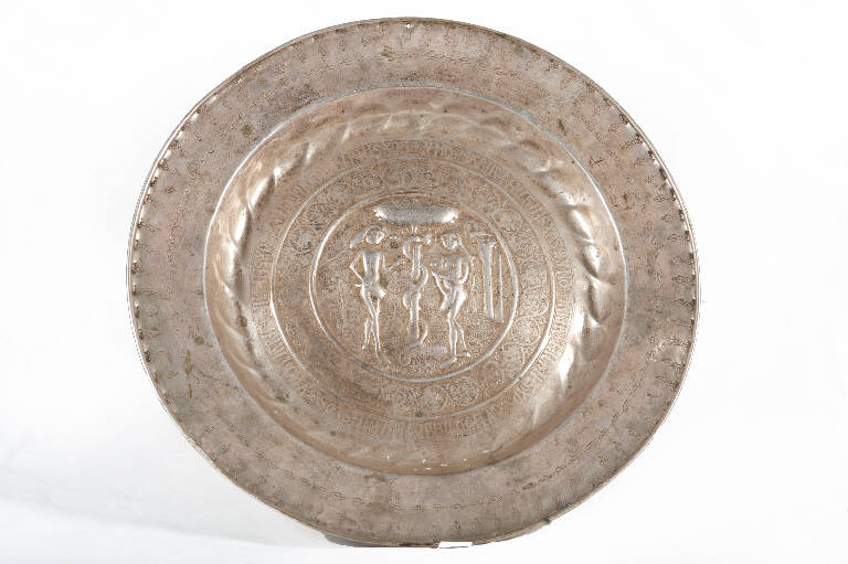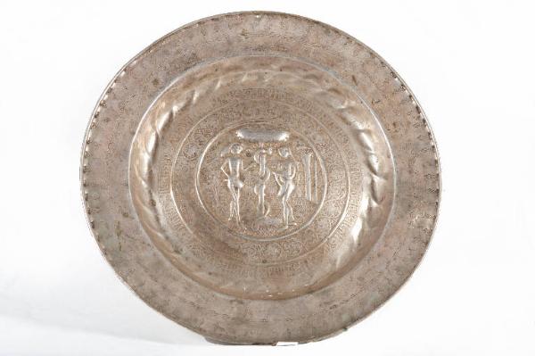 - NOTIZIE STORICO CRITICHE Si tratta di un grande piatto per elemosine di produzione tedesca. La presenza di maestranze tedesche nell'Italia settentrionale e centrale è testimoniata a partire dal XV secolo fino a tutto il Seicento. Elemento attributivo determinante è la scritta in lingua tedesca presente sul bordo esterno del cavetto: si tratta di motivi in gotico capitale in genere indecifrabili (come in questo caso) che rivestono esclusivo carattere decorativo e non epigrafico. I più antichi piatti per elemosine, ascrivibili entro il XV secolo, presentano nel cavetto, al posto del più consueto rosone ricorrente a partire dal Cinquecento, scene sacre. Quella più diffusa risulta essere la tentazione di Adamo ed Eva. Un esemplare identico al manufatto qui schedato, non in ottone ma in bronzo, è conservato presso la chiesa di Santa Maria delle Scale a Ragusa ("Suppellettile ecclesiastica", 1988, pp. 282-283, fig. 141).