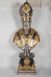 - NOTIZIE STORICO CRITICHE Si tratta di una tipologia già documentata in un inventario del X secolo ma che ebbe la maggiore diffusione dal Quattrocento in poi. Dal reliquiario a testa si passa all'intero busto sino alla vita o di parte di esso. In seguito la tipologia si arricchì e il reliquiario divenne una vera e propia scultura: il santo era rappresentato a mezza figura mentre le vesti erano trattate con cura virtuosistica. L'immagine era poi completata dagli attributi tipici. La struttura lignea era rivestita in metallo più o meno pregiato (in questo caso rame). Inizialmente la reliquia era inserita all'interno della testa, in epoca più recente in piccole teche chiuse da vetro poste o al centro della veste o nella parte anteriore del basamento.\nIl reliquiario in esame, per quanto caratterizzato da una nitida struttura di gusto neoclassico pausata nei suoi vari elementi da spazi vuoti, indugia su un repertorio decorativo di derivazione settecentesca (girali, racemi vegetali e foglie d'acanto) disposto in modo rigorosamente simmetrico, reso con uno sbalzo poco rilevato ma netto nei contorni e privo di quel morbido plasticimo e di quella ricchezza tipici nell'argenteria del periodo. Nella basilica di Santa Maria Maggiore si conservano altri tre esemplari che completano la serie (nn. foto 1311, 1313-1314) che andò a sostituire i dispersi sei busti d'argento del 1673.