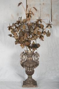- NOTIZIE STORICO CRITICHE Si tratta di vasi usati per disporre i ramoscelli d'ulivo o di palma nel periodo pasquale. Non esistono prescrizioni circa la loro tipologia; generalmente sono realizzati in legno o metallo e la forma più comune risulta quella ad anfora semplice o biansata (come nel nostro caso).\nNei vasi in esame l'introduzione di motivi decorativi ripresi dal repertorio settecentesco esprimono quel rinnovamento linguistico in senso classicista che andava sfoltendo i decori barocchetti razionalizzandoli in un'impaginazione più rigorosa. Pertanto scelte formali e decorative sobrie, proprie del gusto neoclassico, si rivelano in forme rigorose non prive di eleganza, arricchite da tipici motivi ornamentali a perlinature, scanalature, baccellature, foglie lanceolate e acantiformi, mai esuberanti ma piuttosto equilibratamente accostati a nitide e lucide superfici.