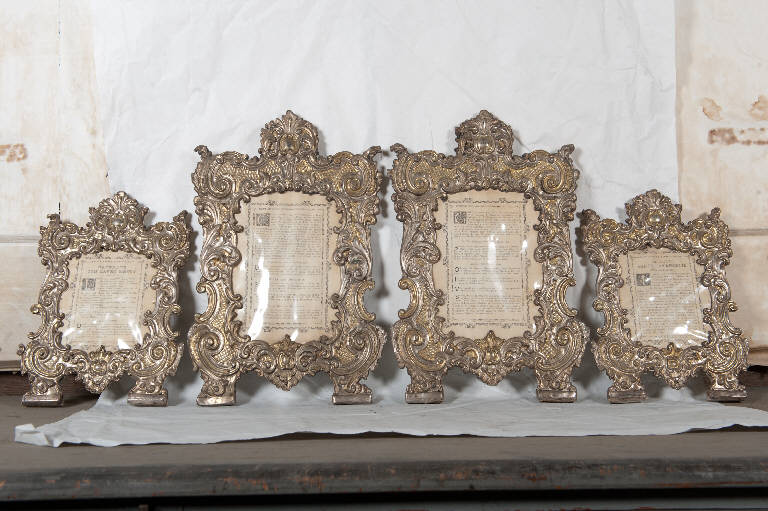 Servizio di cartagloria (due centrali e due laterali) in metallo argentato e dorato. Piedini impostati su fascia liscia. Cornice mistilinea delimitata da volute fitomorfe decorata con racemi vegetali, foglie d'acanto e volute trattate a reticolato; cornice della cartella rifinita da volute acantiformi.