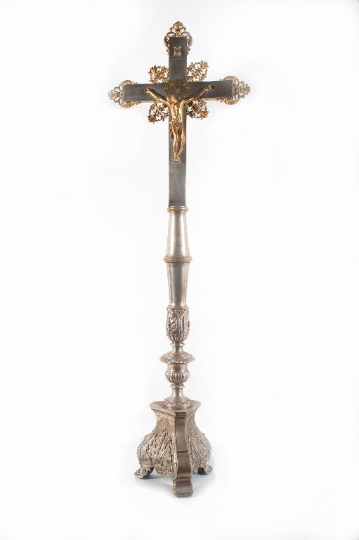 Croce d'altare in ottone argentato e dorato. Peducci a volute arricciate; piede trapezoidale con racemi vegetali e grande foglia d'acanto; fusto decorato con motivi vegetali; nodo ad anfora beccellato nella parte inferiore; croce liscia con racemi vegetali nelle terminazioni; statuetta del Cristo con capo reclinato realizzata a fusione.