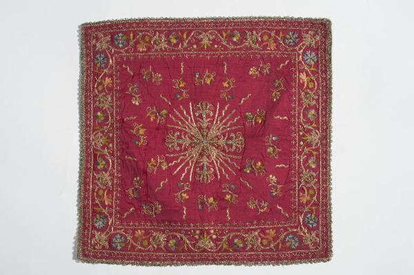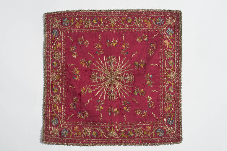 Velo di calice in taffetas rosso. Il ricamo, eseguito in seta policroma, oro filato e argento filato, si sviluppa lungo il perimetro. Si tratta di un racemo vegetale dall'andamento sinuoso a serpentina terminante in corolle fiorite delimitato, sia all'interno che all'esterno, da una piccola greca a gigli di Francia stilizzati. All'interno una croce raggiata d'oro circondata da racemi vegetali singoli terminanti in corolle fiorite. Galloni in argento filato e argento laminato eseguiti a fuselli. Fodera in taffetas di seta verde.