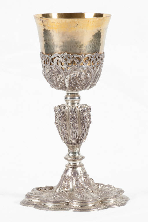 - NOTIZIE STORICO CRITICHE Il calice in esame, di buona esecuzione e di fattura elegante, presenta nella struttura e nella tipologia soluzioni stilistiche tipiche del primo Seicento. E' un esemplare interessante che aiuta a capire il passaggio dal gusto e dalla decorazione cinquecentesca alle nuove esuberanze e ricchezze del barocco. Il ricco e serrato gioco decorativo, dominato da cartelle, volute, teste di cherubino, figure di santi, valve di conchiglia e racemi vegetali, riveste una struttura ancora piuttosto massiccia tanto nella base mistilinea esalobata a più gradini quanto nel fusto; questo è risolto nel caratteristico nodo troncopiramidale con spigoli segnati da cherubini in aggetto. Gli ornati sono resi con una tecnica che impiega uno sbalzo appena rilevato tipicamente seicentesco. Nella basilica di Santa Maria Maggiore si conservano altri calici simili (nn. foto 1266, 1272, 1274). Nella basilica di Santa Maria Maggiore si conservano altri calici simili (nn. foto 1249, 1268, 1275). Pagnoni ipotizza che il calice non sia stato incluso nella confisca napoleonica perché in uso presso uno dei vari altari della basilica (Il manto di Maria, 1995).