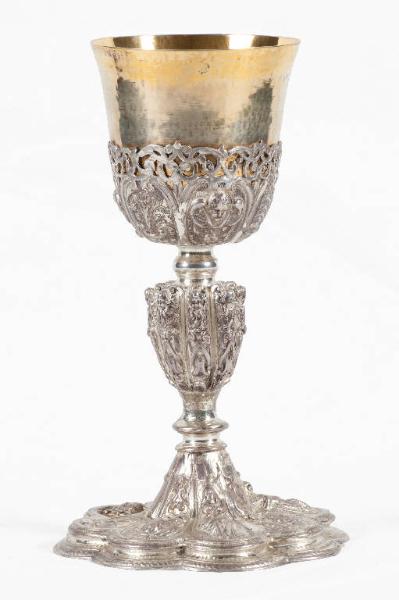 Calice in argento. Piede a forma di corolla floreale a otto petali a più gradini ripartita da cartelle a voluta in cui si alternano la scritta "MIA", teste di cherubino e le figure della Madonna immacolata, di Gesù Bambino redentore e di S. Alessandro (?). Fusto con nodo troncopiramidale ornato da cherubini con funzione di cariatide inseriti a fascio; collarino e nodo di raccordo a rocchetto. Sottocoppa, eseguito a sbalzo, decorato con racemi vegetali e specchiature all'interno delle quali si alternano teste di cherubino, simboli del giglio e dell'ulivo.