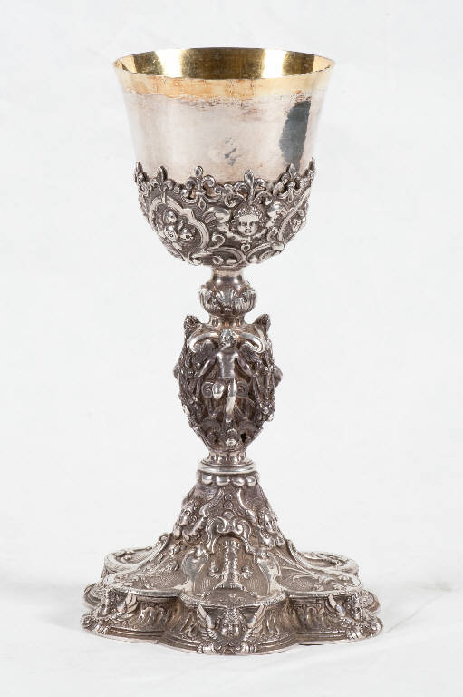 Calice in argento. Piede mistilineo esalobato ad alto gradino decorato da teste di cherubino e ripartito da cartelle a voluta in cui si alternano giglio, sole, luna, torre, corona, palma del martirio e fiori. Fusto con nodo troncopiramidale ornato da putti reggifestone con volute; collarino e nodo di raccordo a rocchetto. Sottocoppa, eseguito a sbalzo, decorato con racemi vegetali, teste di cherubino e specchiature all'interno delle quali si alternano serti di frutta.