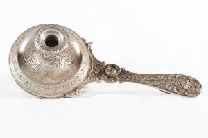 Palmatoria in ottone argentato. Base a forma di piattello circolare con tesa decorata da teoria di foglie d'acanto, all'interno girali vegetali. Corto fusto globulare terminante in un bocciolo ornato da teoria di ovoli. Impugnatura sagomata decorata con testa di cherubino, foglie d'acanto, serti vitinei, spighe e motivi floreali.