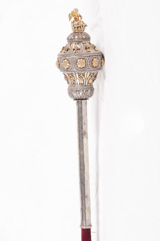Verga del cerimoniere in argento con parti dorate. Asta in argento coperta da velluto rosso. Innesto a tubo. Collarino decorato nella parte inferiore da teoria di foglie d'acanto e perlinatura e nella parte superiore da fiori con foglie dorate all'interno di scanalature. Pomo sagomato decorato nella parte inferiore da greca di fiori dorati inseriti in cerchi perlinati e nella parte superiore da fiori con foglie dorate all'interno di scanalature. Terminale figurato a forma di angioletto seduto in argento dorato.
