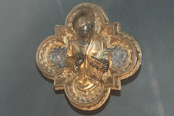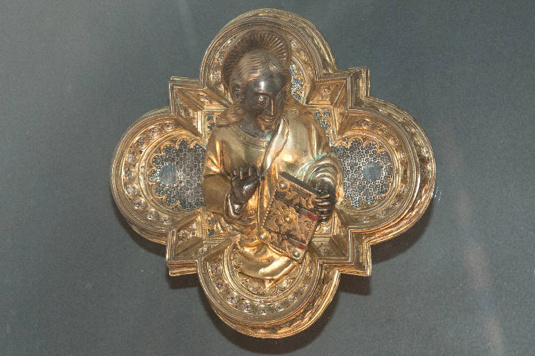 Formella quadriloba in argento con parti dorate. Al centro è raffigurato San Matteo Evangelista.