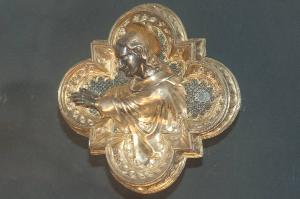 Formella quadriloba in argento con parti dorate. Al centro è raffigurato San Giovanni dolente.