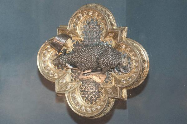 Formella quadriloba in argento con parti dorate. Al centro è raffigurato l'Agnus Dei.