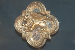 Formella quadriloba in argento con parti dorate. Al centro è raffigurato un leone alato, simbolo di San Marco Evangelista.