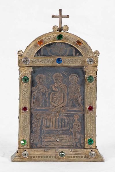 Pace architettonica in argento. Forma di ancona rinascimentale decorata con motivo a cerchi nel basamento e motivo fogliaceo nelle lesene e nella trabeazione. Targa figurata con Gesù Cristo in pietà tra la Madonna, San Giovanni Evangelista e in basso due santi. Dio Padre reggente un cartiglio nella lunetta. Basamento, lesene e trabeazione del fastigio decorati da vetri colorati incastonati.