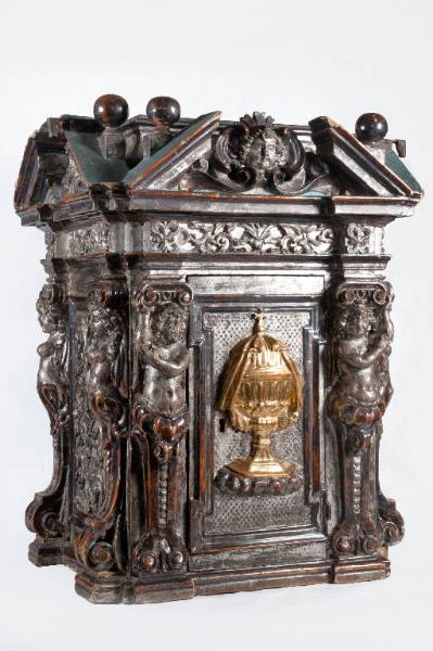 - NOTIZIE STORICO CRITICHE Il tabernacolo è un'edicola chiusa da uno sportello contenente la pisside con le specie consacrate non consumate. Verso la metà del Cinquecento il vescovo di Verona introdusse l'uso del tabernacolo eucaristico fisso al centro dell'altare chiuso da una robusta serratura per evitare furti. Questa prassi si diffuse non solo nella sua diocesi ma in tutta l'Italia settentrionale. Inoltre doveva essere inamovibile e non coperto da altri arredi. Il tabernacolo corrisponde sempre a tipologie architettoniche: nella sua forma più semplice è un tempietto definito da paraste e frontone inserito nel gradino dell'altare; in altri casi può fare parte dell'insieme architettonico dell'altare; infine può essere un vero e proprio tempietto con struttura indipendente da quella dell'altare come quello in esame. Tale manufatto, realizzato in legno argentato con la decorazione dello sportello dorata, presenta un basamento modanato. Nelle specchiature delle lesene angolari sono scolpiti degli angeli cariatide sormontati da capitelli a volute arricciate. I fianchi sono decorati da motivi vegetali a intaglio. Nella trabeazione si sviluppano racemi vegetali mentre la cupola è costituita da timpani spezzati all'interno dei quali si inseriscono delle teste di cherubino. Al centro dello sportello rifinito da una cornice modanata è raffigurata una pisside dorata. L'impianto architettonico, gli angeli cariatide scolpiti nelle lesene, il timpano spezzato e l'eleganza dell'intaglio inducono a datare tale oggetto alla seconda metà del Seicento.