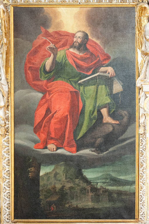 - NOTIZIE STORICO CRITICHE Nel 1588 Cavagna accettò di eseguire una pala per l'ancona dell'altare di San Giovanni alla condizione che se l'opera non fosse piaciuta ai committenti non sarebbe stato retribuito. Il contratto venne sottoscritto dalla MIA il 19 febbraio 1589 (cfr. "Scritture", 19 febbraio 1582, LXIV, f. 22v, Biblioteca Civica, Bergamo). Nei documenti dell'Archivio risulta però un pagamento di 22 scudi in data 12 agosto 1589 (cfr. "Terminazioni", 1586-1589, XXX, f. 180r, Archivio Congregazione Misericordia Maggiore, Bergamo). Per l'artista bergamasco si tratta del primo incarico di una certa importanza, se si escludono alcuni lavori eseguiti poco prima per il Palazzo del Podestà. Da quel momento la sua attività si intensificò e procedette ad un ritmo talmente energico da vederlo impegnato su più fronti.\nLa visione è descritta su un doppio registro: in alto troviamo San Giovanni assiso dentro una nuvola investito dalla luce divina in attesa di scrivere sotto dettatura. Con il ginocchio sinistro sostiene un libro mentre il piede poggia su un'aquila, suo attributo iconografico. In basso troviamo l'isola di Patmos dove, secondo la tradizione, Giovanni scrisse il libro dell'Apocalisse. L'isola è qui riprodotta in un'atmosfera offuscata dall'incombere di nuvole che risente di influenze nordiche. Sotto una tettoia di legno, in un luogo appartato al di fuori delle mura della città, Cavagna dipinse un'altra figura di Giovanni intenta a scrivere l'ultimo testo dei Vangeli. A sinistra, all'interno di una tabella appesa al ramo di un albero, è posta la firma del pittore. \nL'accensione cromatica rivela delle ascendenze venete, cui si accompagnano il contrasto luminoso di derivazione savoldesca dato dagli effetti naturalistici e il plasticismo del Piazza e del Peterzano. \nL'opera è stata restaurata tra il 1961 (anno di stipula del contratto, cfr. "Contratto", 21 febbraio 1961) e il 1962 da Franco Steffanoni (cfr. "Relazione sui lavori di restauro eseguiti ai dipinti della Basilica di Santa Maria Maggiore per incarico dell'E.C.A. di Bergamo", 29 giugno 1962, protoc. 1519, cat. 5, clas. 6, fasc. 17, Archivio Congregazione Misericordia Maggiore, Bergamo e "Relazione di pagamento", 23 luglio 1962, protoc. 1666, cat. 5, clas. 6, fasc. 17, Archivio Congregazione Misericordia Maggiore, Bergamo).
