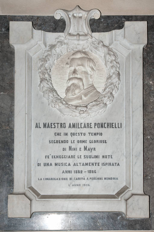 Lapide commemorativa: nella parte superiore, entro cornice circolare fogliacea, busto del maestro Amilcare Ponchielli; nella parte inferiore, iscrizione con lettere ripassate a pennello nero.