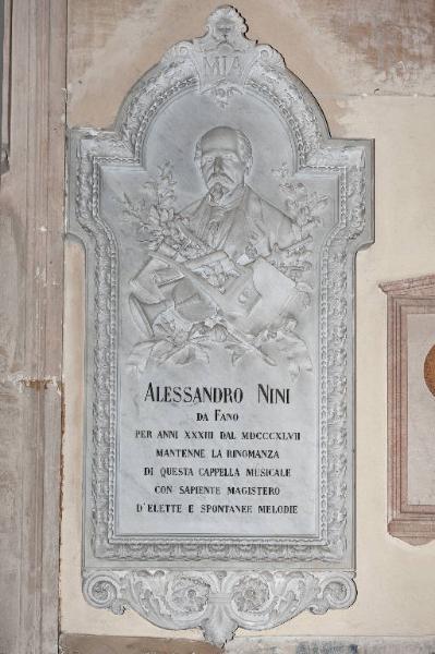- NOTIZIE STORICO CRITICHE La lapide, che si ipotizza postuma, reca il busto di Alessandro Nini circondato da foglie di alloro e strumenti musicali. Commemora la sua opera come maestro di Cappella della Basilica di Santa Maria Maggiore dal 1847 al 1880, anno della morte. \nAlessandro Nini (1805-1880) è stato anche compositore, musicista e direttore della Scuola imperiale di canto a Pietroburgo e di varie cappelle musicali italiane.