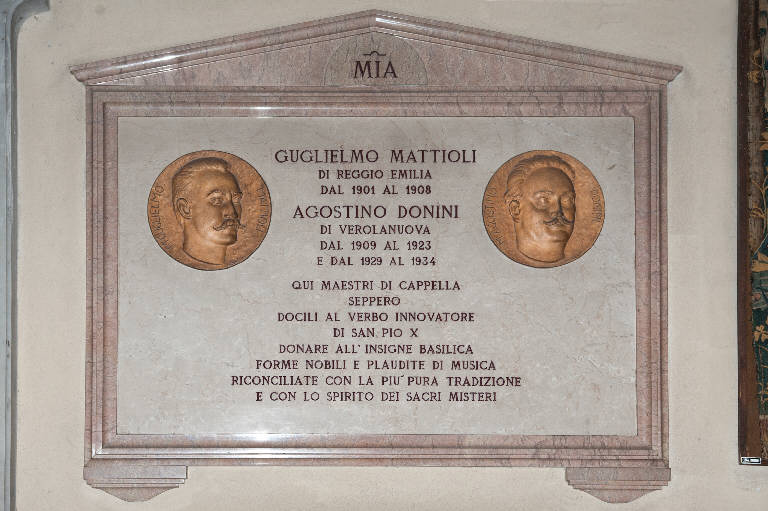 - NOTIZIE STORICO CRITICHE La lapide, che reca due medaglie in bronzo raffiguranti i volti di Guglielmo Mattioli e Agostino Donini, commemora la loro opera come maestri di Cappella della basilica di Santa Maria Maggiore. \nLe medaglie in bronzo furono realizzate da Piero Brolis. Nato a Bergamo nel 1920, frequentò il corso di decorazione alla Scuola d¿Arte Andrea Fantoni e quello di scultura all'Accademia Carrara dove ottenne la licenza nel 1939. Fu allievo del pittore Contardo Barbieri e dello scultore Gianni Remuzzi, del quale frequentò pure, per diversi anni, lo studio. Nel luglio 1942 conseguì il diploma di Maturità Artistica a Milano presso il Liceo Artistico di Brera. Si dedicò alla scultura, alla grafica, alla pittura e alla medaglistica. Dal 1961 al 1971 si dedicò alla sua opera maggiore, la monumentale Via Crucis di bronzo, commissionatagli per il Tempio di Ognissanti del Cimitero di Bergamo, unica nel suo genere per dimensione e concezione. Morì a Bergamo nel 1978.\nGuglielmo Mattioli (1857-1924) si trasferì a Bergamo nel 1901 dove assunse due importanti cariche tra loro correlate: la direzione della cappella musicale di S. Maria Maggiore (fino al 1908) e quella dell¿istituto musicale G. Donizetti (che prevedeva anche l¿insegnamento della composizione). Dedicatosi con entusiasmo al nuovo compito attuando la riforma di Pio X, riuscì in breve a rinvigorire la qualità artistica d¿entrambe le istituzioni e, tranne qualche isolata e sterile contestazione, si guadagnò unanime apprezzamento. Proprio durante il soggiorno bergamasco la sua vena creativa conobbe feconda ispirazione.\nAgostino Donini (1874-1937) si trasferì a Bergamo nel 1909 per succedere a Guglielmo Mattioli come maestro della cappella di S. Maria Maggiore, incarico che ricoprì in due riprese (dal 1901 al 1923 e dal 1929 al 1934).